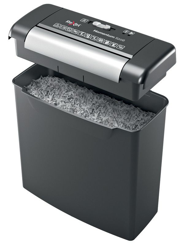 The Rexel Momentum S206 Paper Shredder is a compact strip-cut shredder ideal for use at home to dispose of confidential documents such as bank statements, bills and receipts. It shreds up to 6 sheets at a time into the easy to empty 9L bin which holds up to 75 sheets of shredded paper. Each A4 sheet is shredded to P-2 security level for everyday shredding.